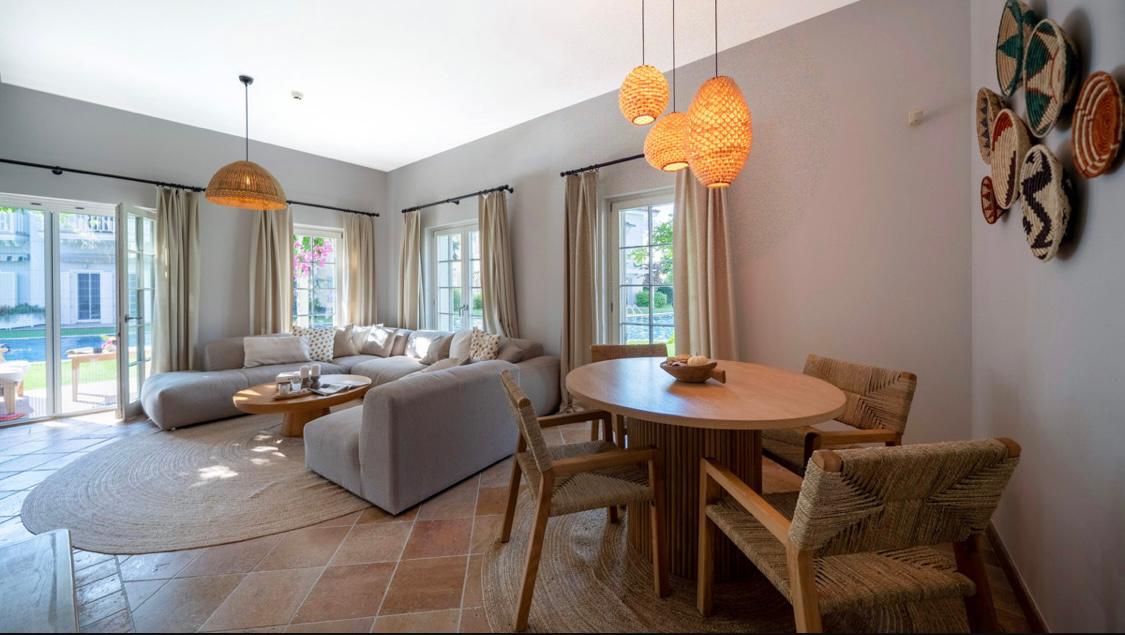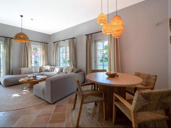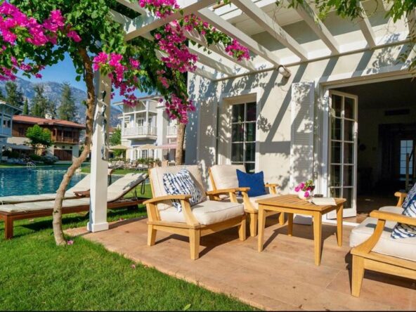 Designed by the world-renowned American company WATG, Portville Holiday Villas is one of the most prestigious and stylishly designed sites in Gocek, Turkey. Located between D-Resort Hotel and D-Marin, the complex especially appeals to sea and boat enthusiasts. It is located on 46 thousand m² of land nested with the sea. Portville Holiday Villas consists of 130 luxury villas. While a long swimming pool surrounds 79 throughout the site, the other 51 villas have a sea connection with canals. Each villa surrounded by the pool has direct access to the pool from its garden. Villa 45 is one of them, surrounded by the pool.