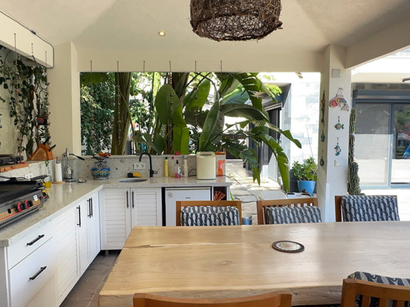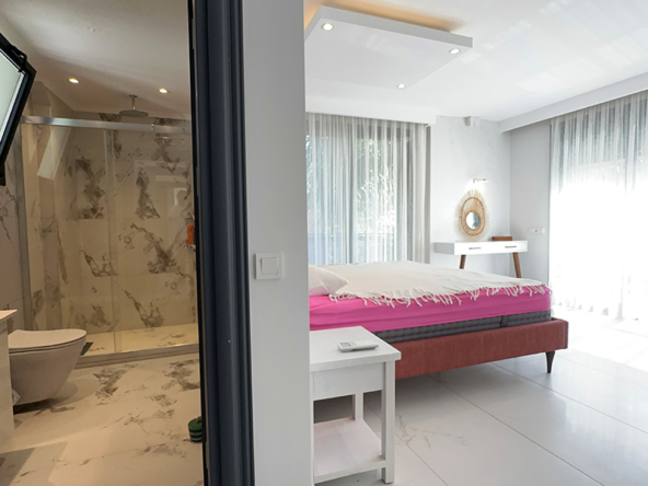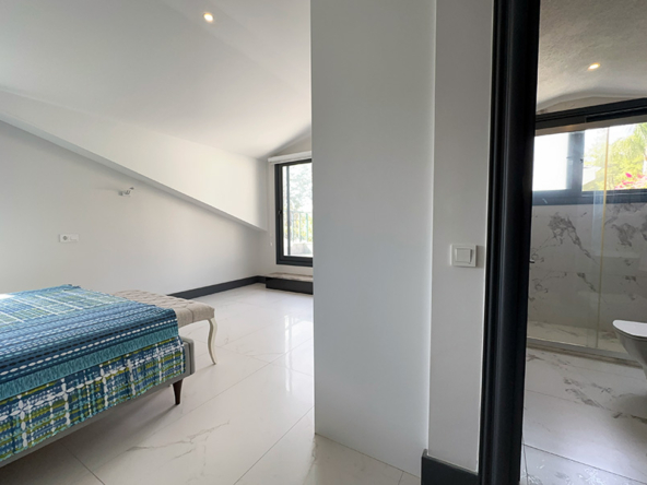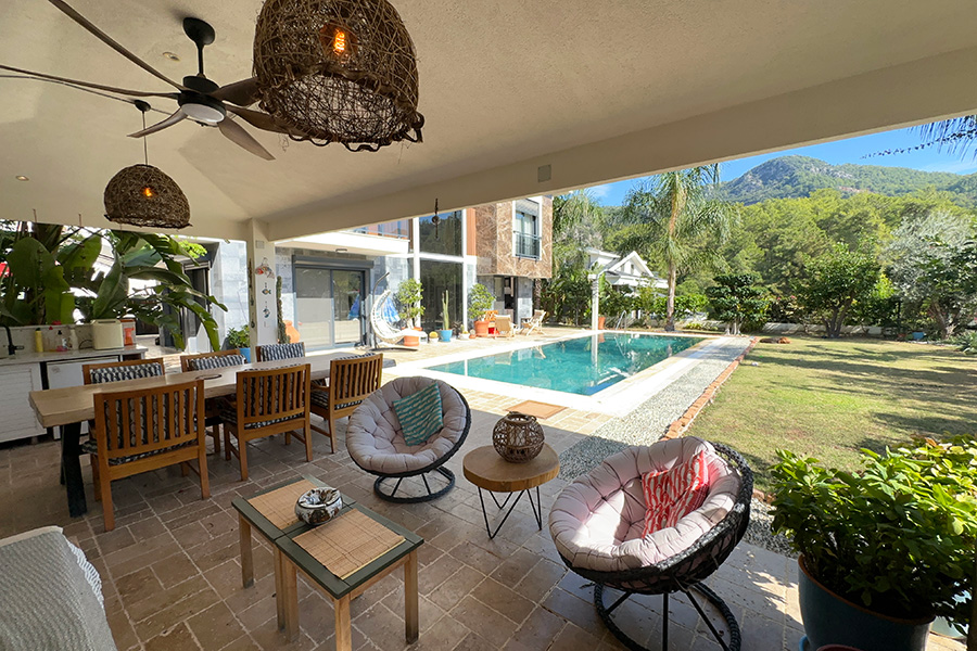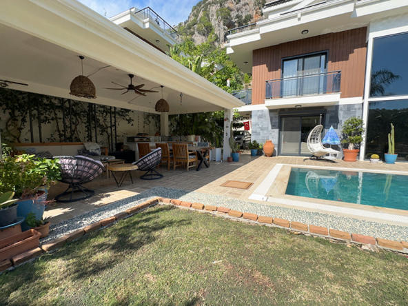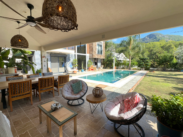 Exceptional Outdoor Living: A completely private swimming pool is the focal point of the expansive, expertly landscaped garden. The meticulously designed outdoor areas include large sunbathing zones and dedicated, sheltered seating and dining areas, making al-fresco meals against the backdrop of the Göcek mountains a daily pleasure.