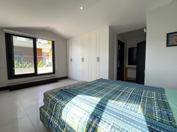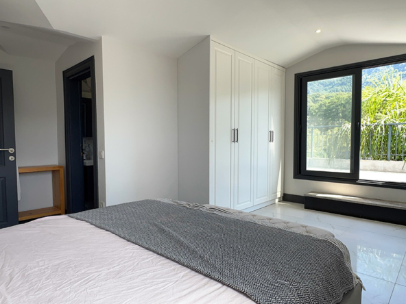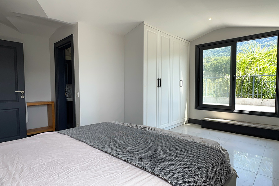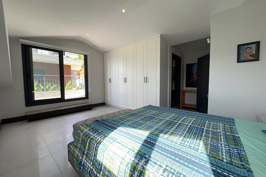 The upper level is home to a truly magnificent master bedroom, complete with its own private en-suite bathroom and a secluded balcony that offers breathtaking views of the lush landscape. It serves as a peaceful retreat where you can start your day with a coffee and the gentle rustle of the trees. Two additional guest rooms provide ample space for family and friends; one is furnished with a double bed, while the other features two single beds, making it perfect for children or a shared space. The villa also includes a practical utility room, ensuring all your storage needs are met without compromising the clean, minimalist aesthetic.